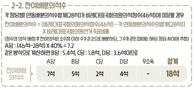 | 잔여배분 의석수 | 7석 | 5석 | 2석 | 4석 | - | 38석 |