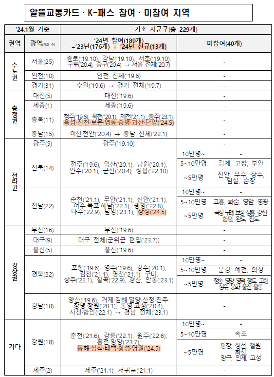 K 패스 카드 대상 지역은 인구 10만 명 이상인 기초자치단체와 세종특별자치시, 제주특별자치도 제주시 및 서귀포시의 주민은 모두 사용이 가능합니다. 현재 서울, 인천, 경기, 대전, 세종, 광주, 부산, 대구, 울산 등의 주요 지자체 모두 참여 176개의 지자체가 참여하고 있고 추가로 동해, 삼척, 태백, 횡성, 영월, 음성, 진천, 보은, 영동, 증평, 괴산, 단양, 장성 13개의 지자체가 추가로 참여합니다.